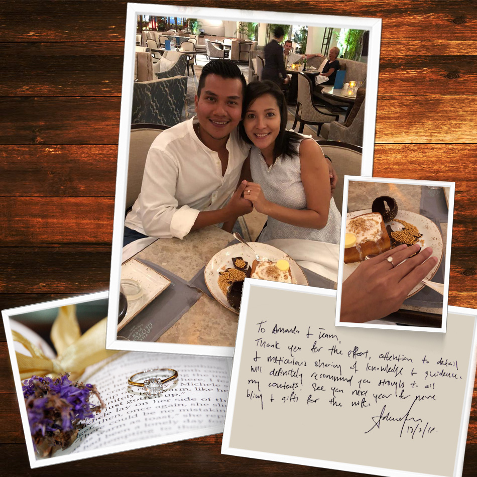 “To Amanda & team, thank you for the effort, attention to detail & meticulous sharing of knowledge & guidance. Will definitely recommend you strongly to all my contacts!  See you next year for more bling & gifts for the wife.” – Adamson