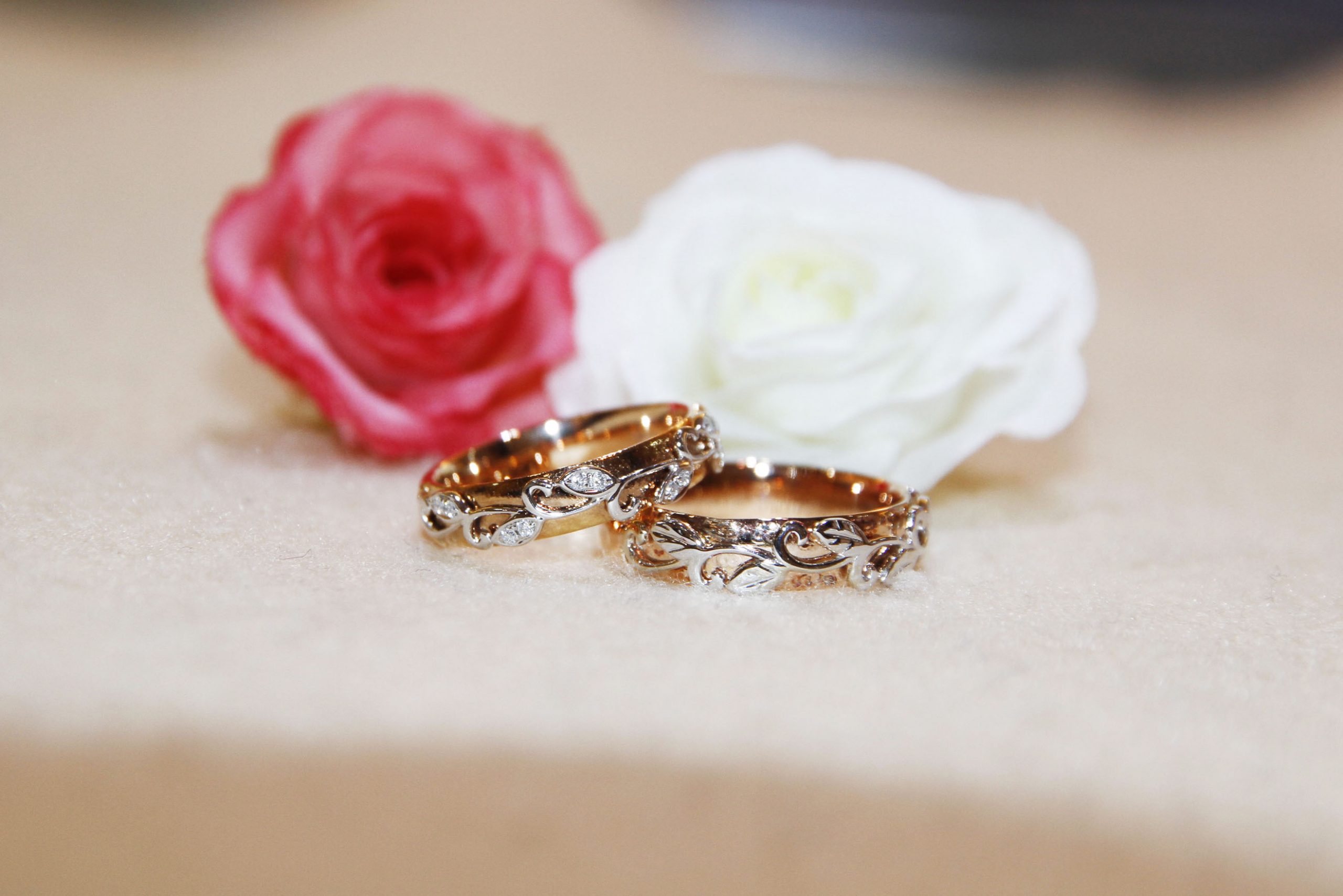 Ornate cravings and bold patterns are key features of the Peranakan style, which is characterized by art and design blended with visually appealing and contrasting elements of Chinese and Malay antique motifs. You will love these pair of wedding bands and engagement ring, symbolizing understanding, balance and extravagance.