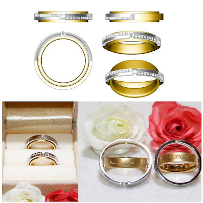 Couples looking to create a special pair of bands will love this unique pair of rotating rings. Perfectly set in yellow and white velvet, the rings revolve around an axis, creating an orb which may signify completeness and wholeness. Coupled with petite diamonds, the rings reveal engravings on the inner circle to give the wearer a sign of his/her unique identity.
