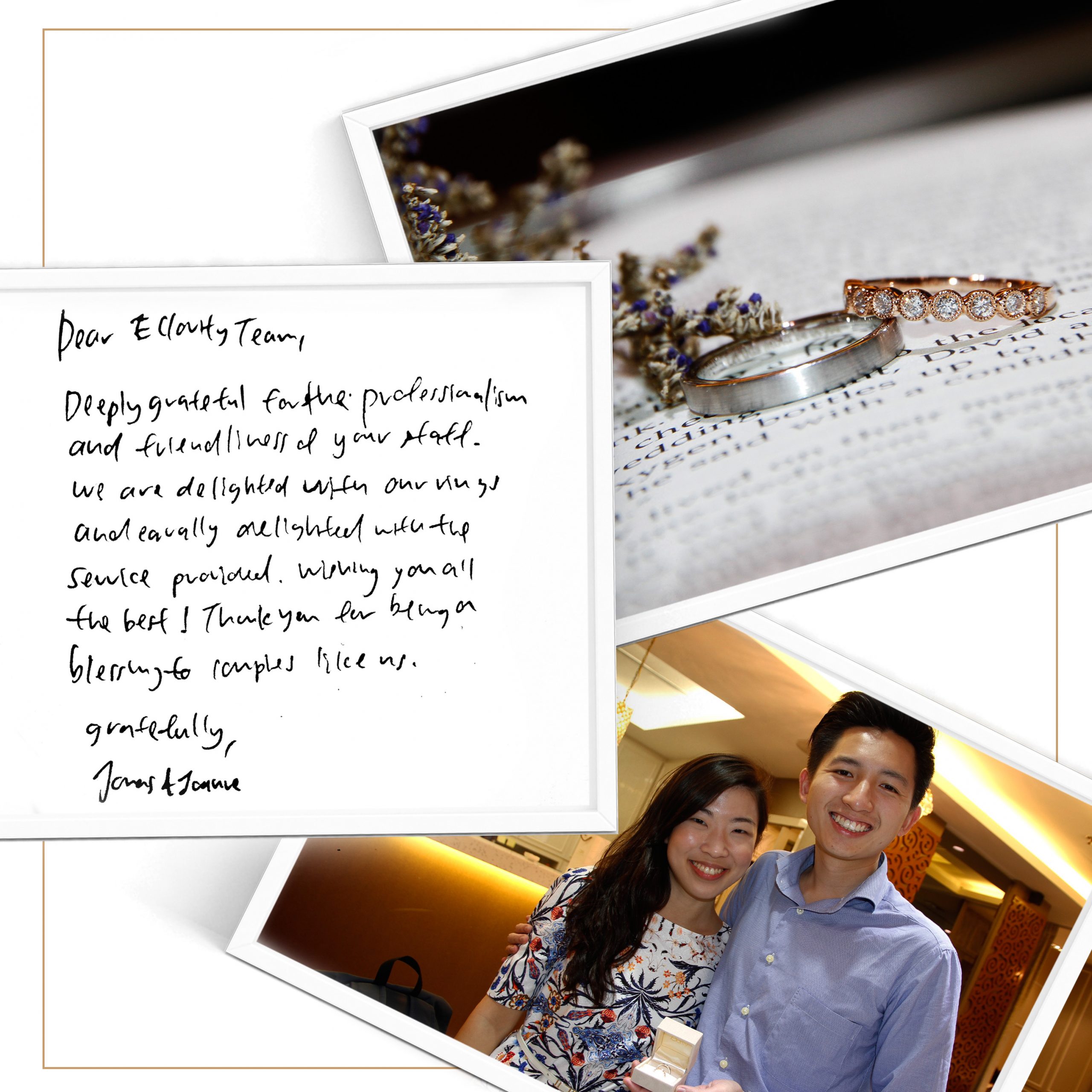 “Dear eClarity team, deeply grateful for the professionalism and friendliness of your staff. We are delighted with our rings and equally delighted with the service provided. Wishing you all the best! Thank you for being a blessing to couples like us.” – Gratefully, Jonas & Joanie