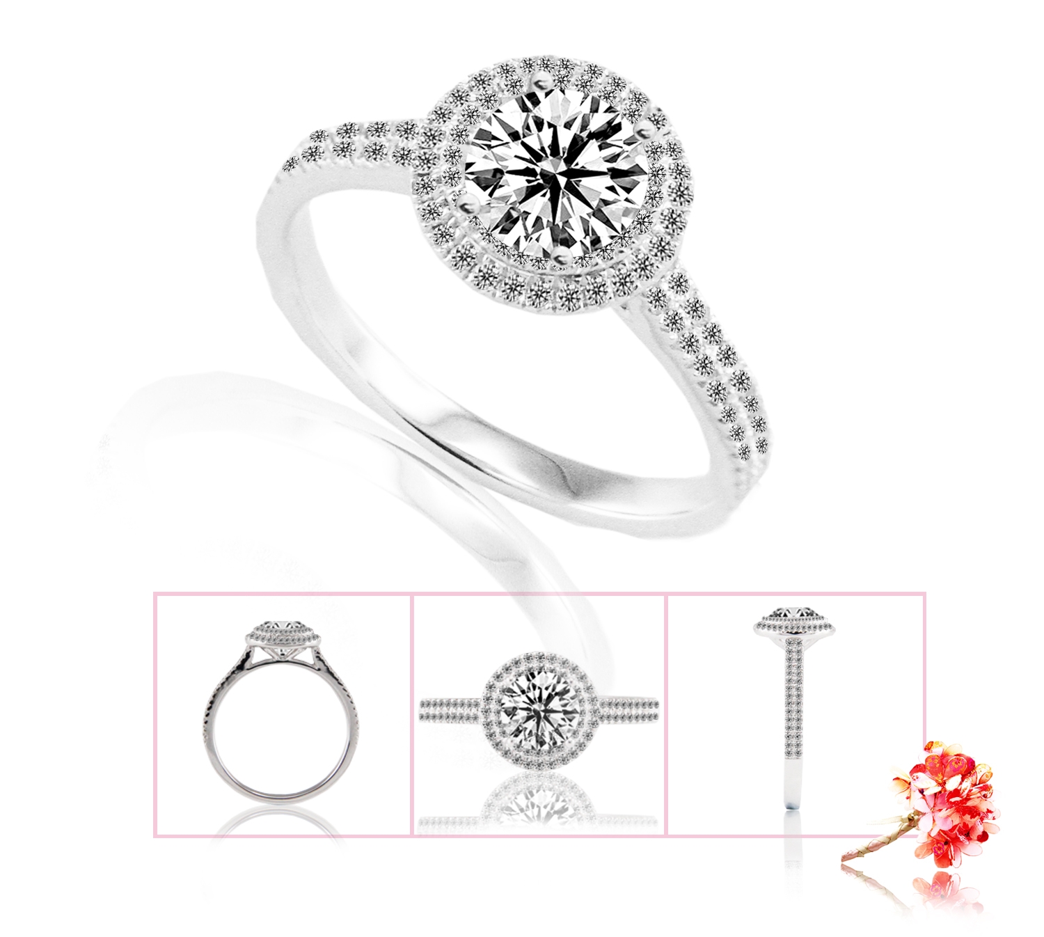 eClarity extravagant halo ring setting, scintillating with 108 round brilliant diamonds 0.33 carat in 18k gold, white.