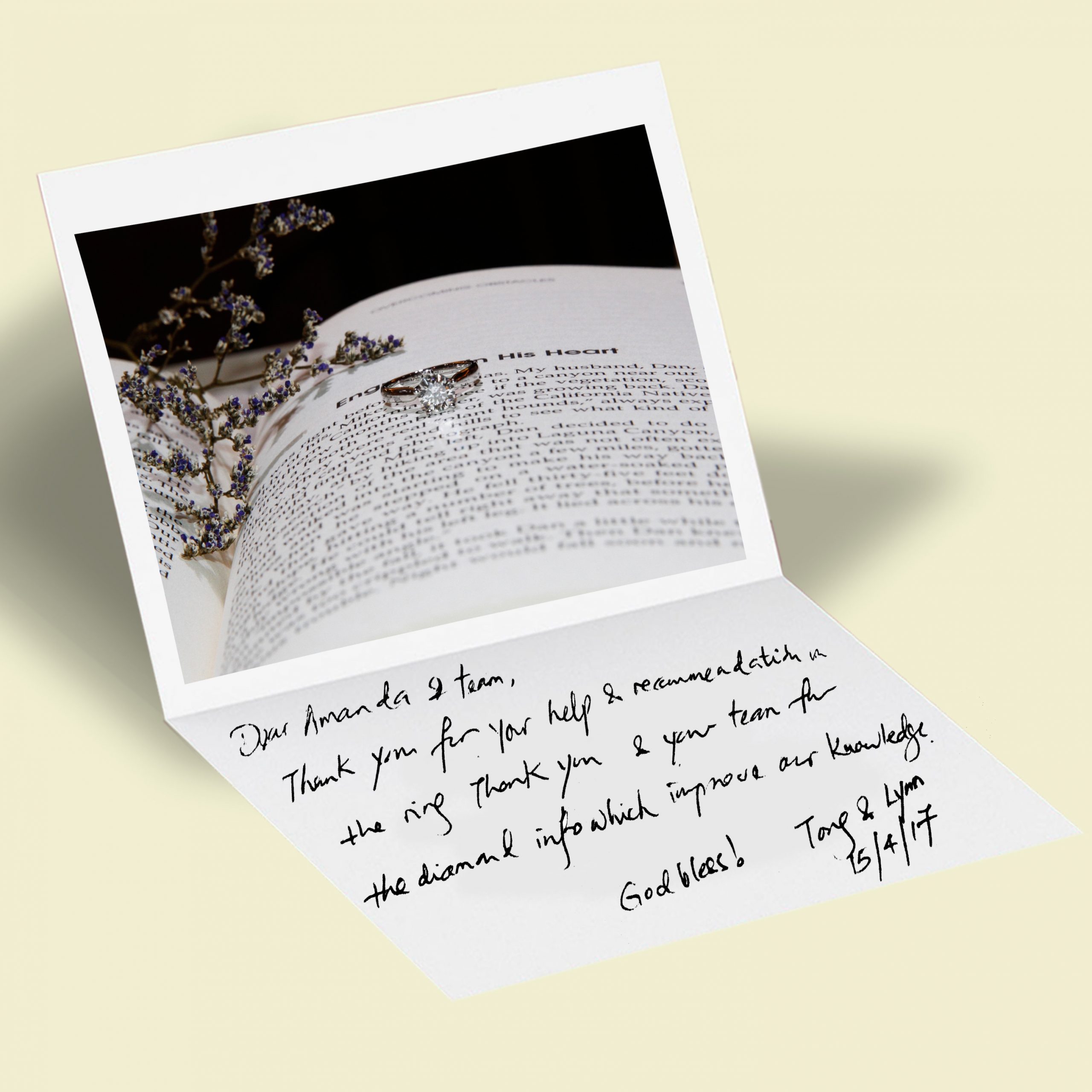 “Dear Amanda & team, thank you for your help & recommendation in the ring. Thank you & your team for the diamond info which improve our knowledge. God bless!” – Tong & Lynn