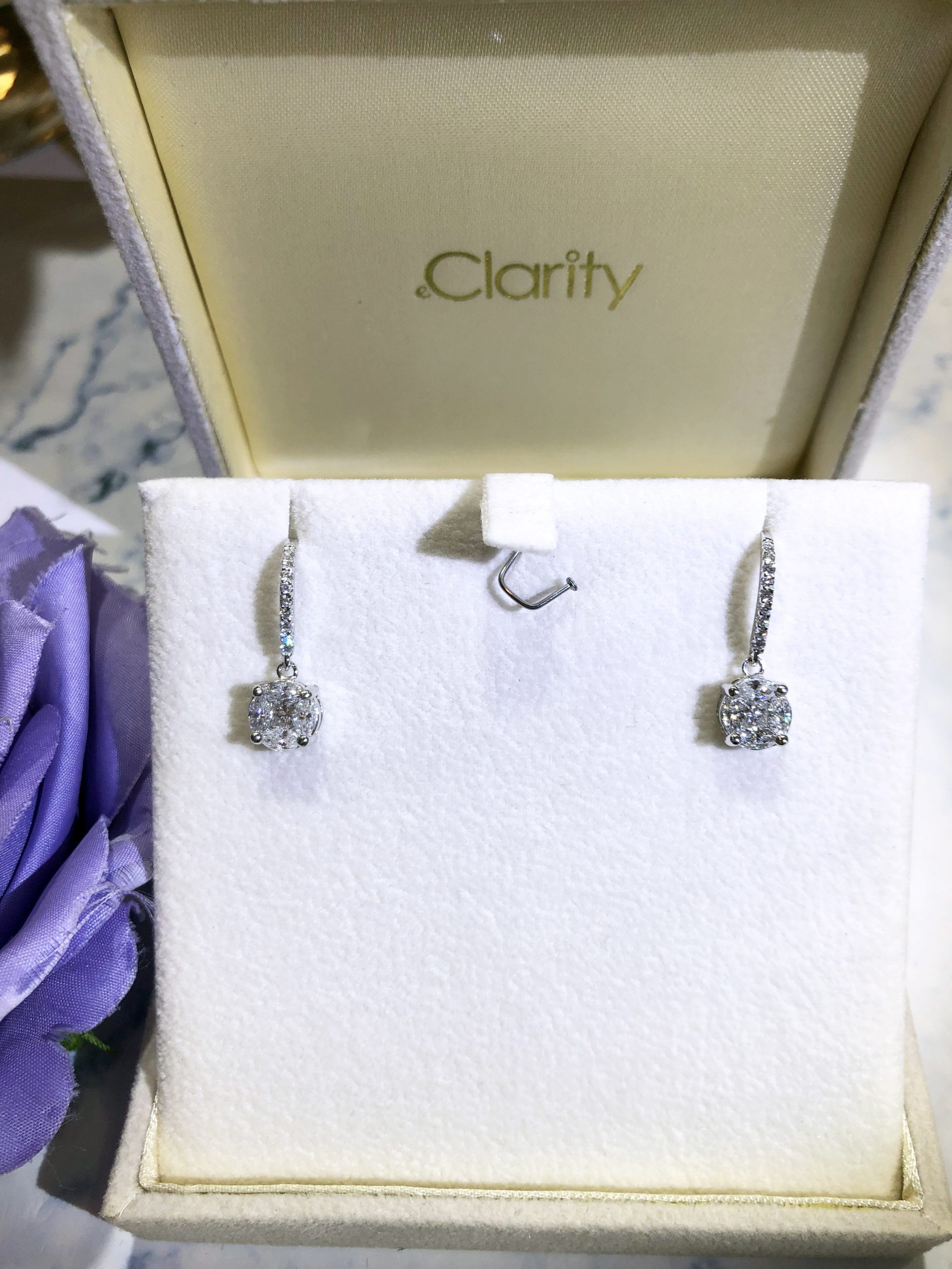 Encircling her ears and glowing, this pair of dangling eClarity earrings is a product of sophisticated craftsmanship. eClarity’s master artisans precisely mounted princess brilliant cut and marquise brilliant cut diamonds form round shaped to present over 1.5 carat diameter each. #FreshlyBaked #eClarity #diamond #earrings