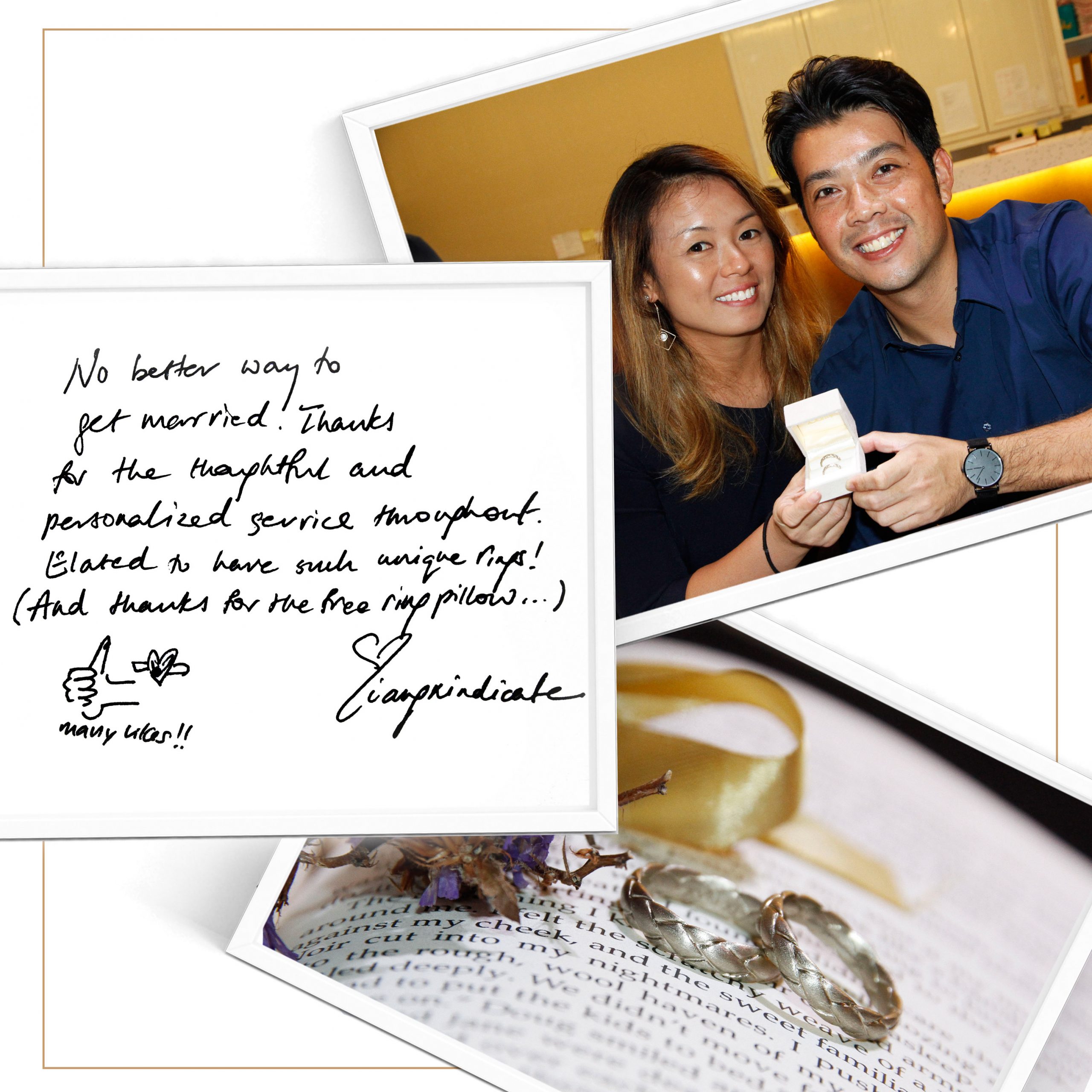 “No better way to get married. Thanks for the thoughtful and personalized service throughout. Elated to have such unique rings! (And thanks for the free ring pillow…)” – Yu liang