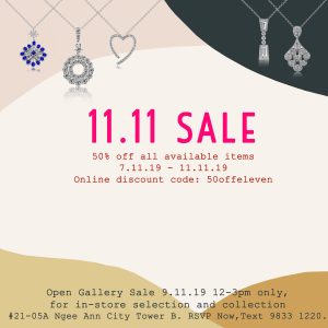 eClarity reveals the 11.11 event, 50% off all available items. Do RSVP into the world of all jewellery at Ngee Ann City Tower B. This 11.11 event features all available pendants, necklaces, bracelet, bangles, earrings, wedding bands and bridal jewellery with wide range of designs.
