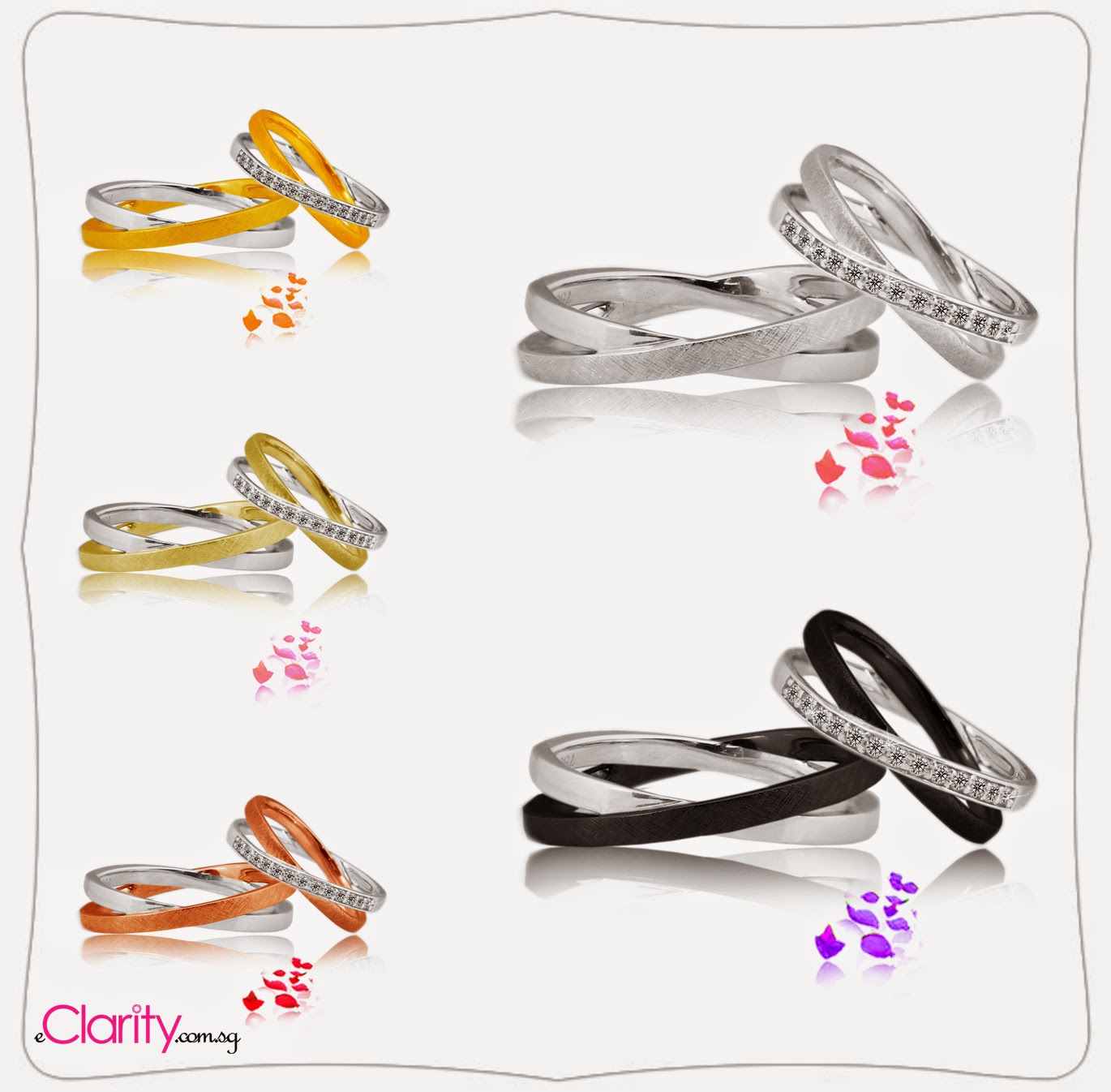 For his wedding bands, 18k gold, white, rose, yellow, champagne or black gloss and antique matte.