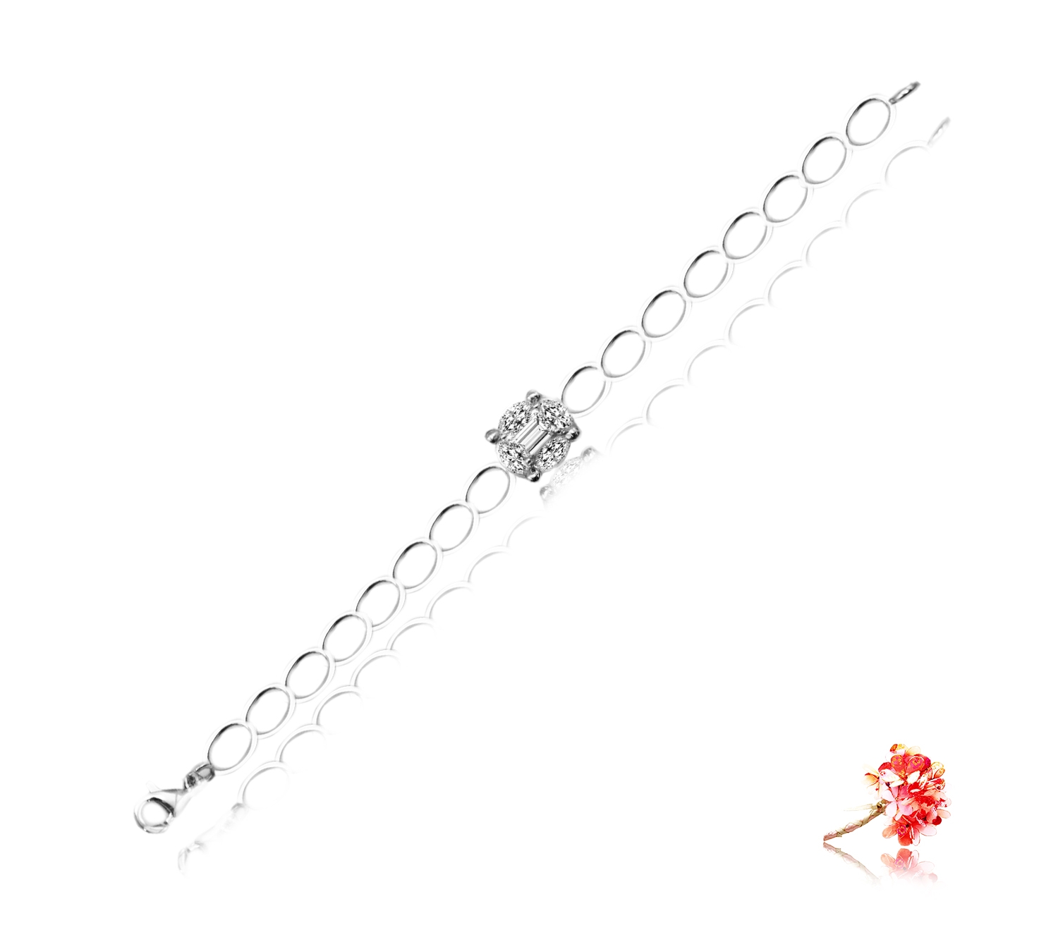 Diamond bracelet with 1 baguette diamond 0.29 carat and 4 marquise diamonds 0.365 carat in 18k gold, white.