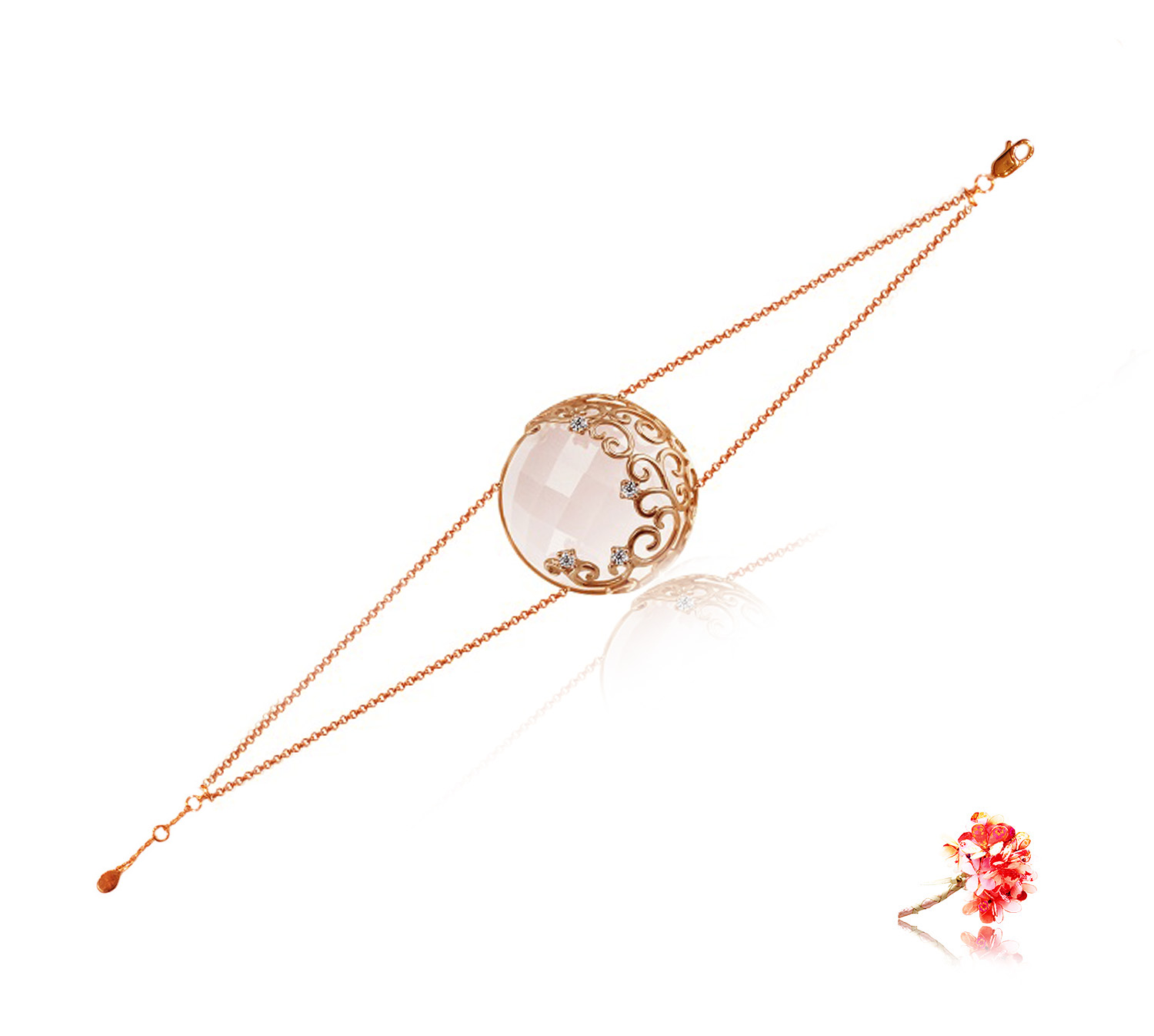 Diamond bracelet with 1 rose quartz 27.95 carat and 4 round brilliant diamonds 0.056 carat in 18k gold, rose.