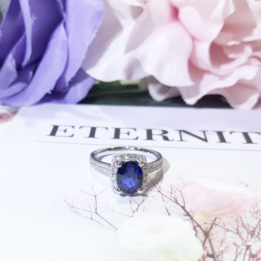 Blue Sapphire ring with 1 Oval Blue Sapphire 1.46ct and 78 round brilliant diamonds 0.35 carat in 18k gold, white.