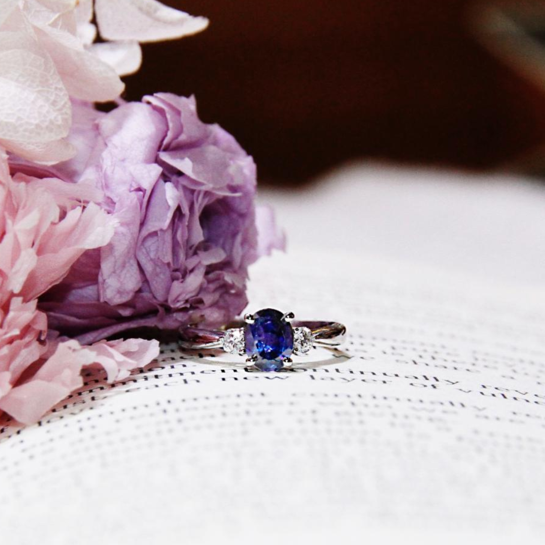 Home Bespoke / Customised Jewellery Blue Sapphire Ring with Diamonds in 18k Gold White, Trilogy