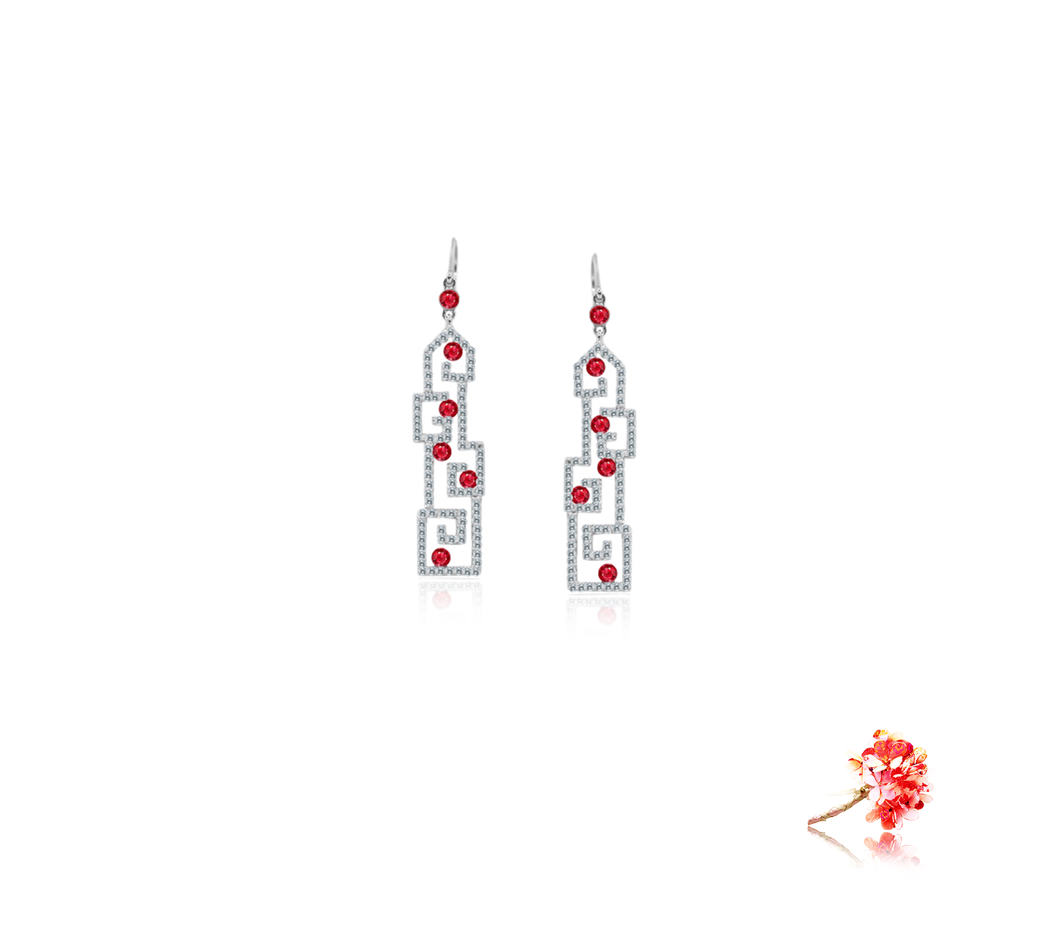 Ruby earrings with 12 round cabochon rubies 0.51 carat, 188 round brilliant diamonds 0.75 carat in 18k gold, white.