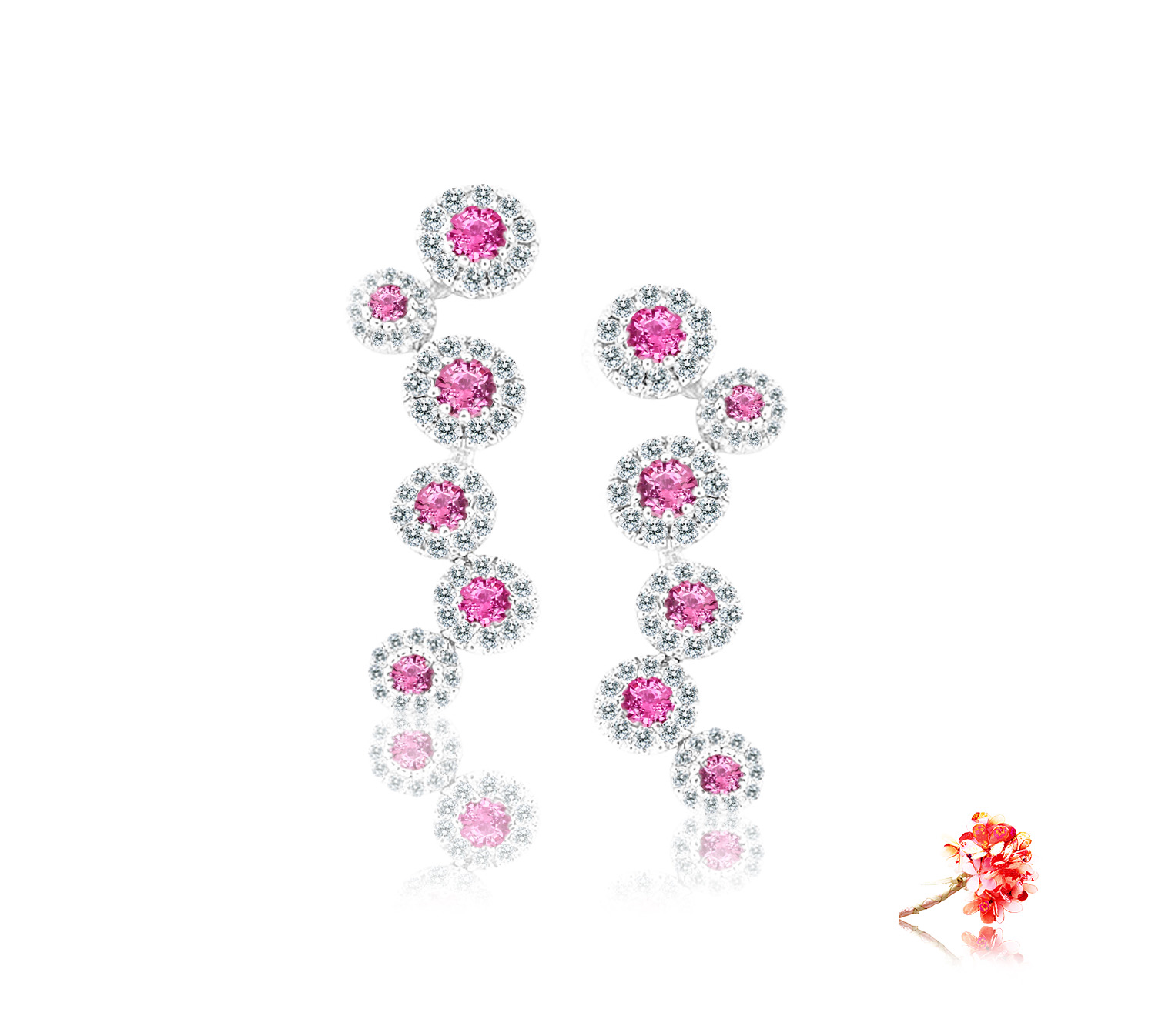 Pink sapphire diamond earrings with 12 pink sapphires 1.70 carat and 128 round brilliant diamonds 0.90 carat in 18k gold, white.