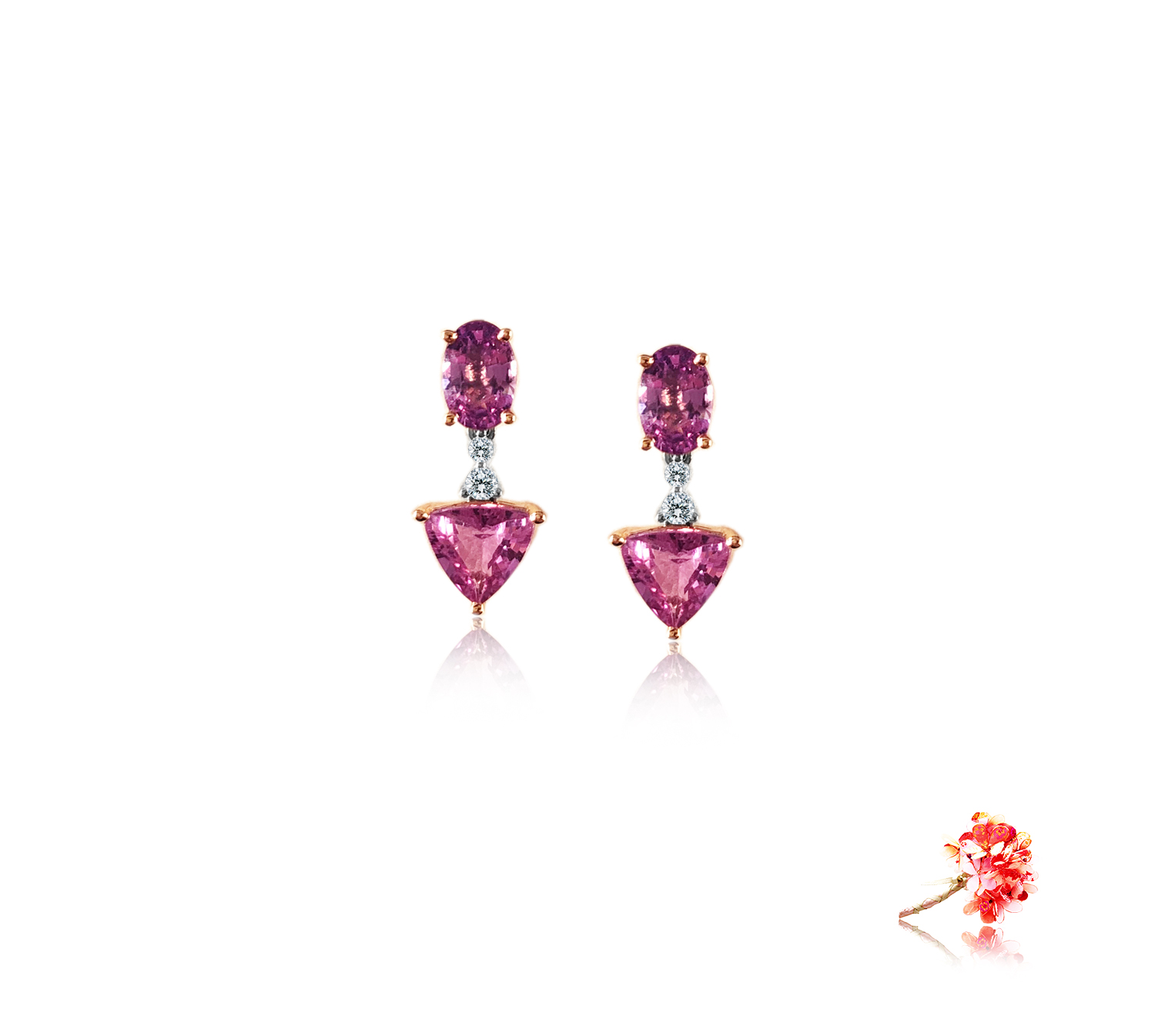 Earrings with 4 pink sapphires 2.80 carat and 4 round brilliant diamonds 0.06 carat in 18k gold, white. (E537)