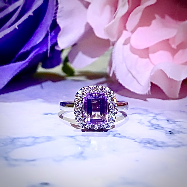 Home Bespoke / Customised Jewellery Emerald Amethyst in 18k White Gold, Halo