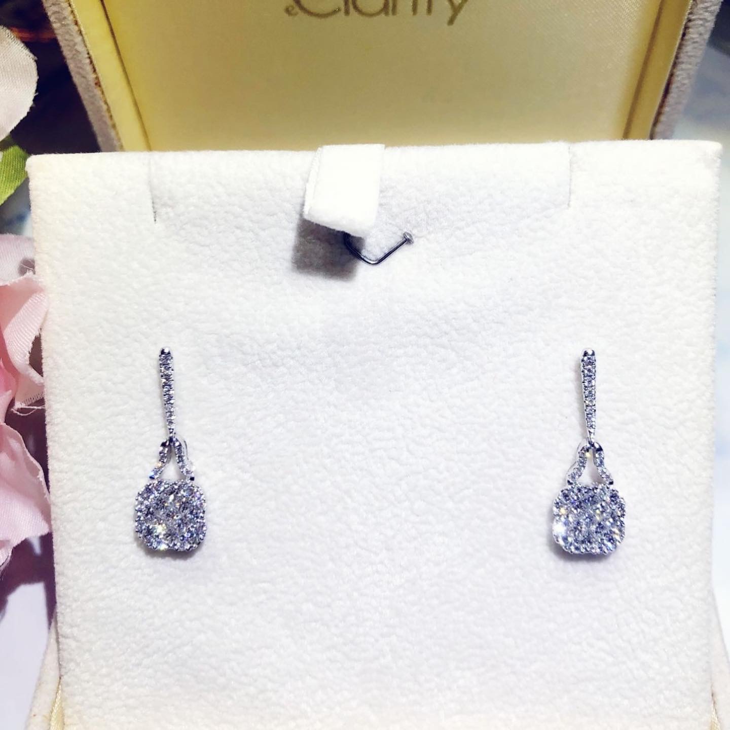 Halo diamond earrings with diamonds in 18k white gold.