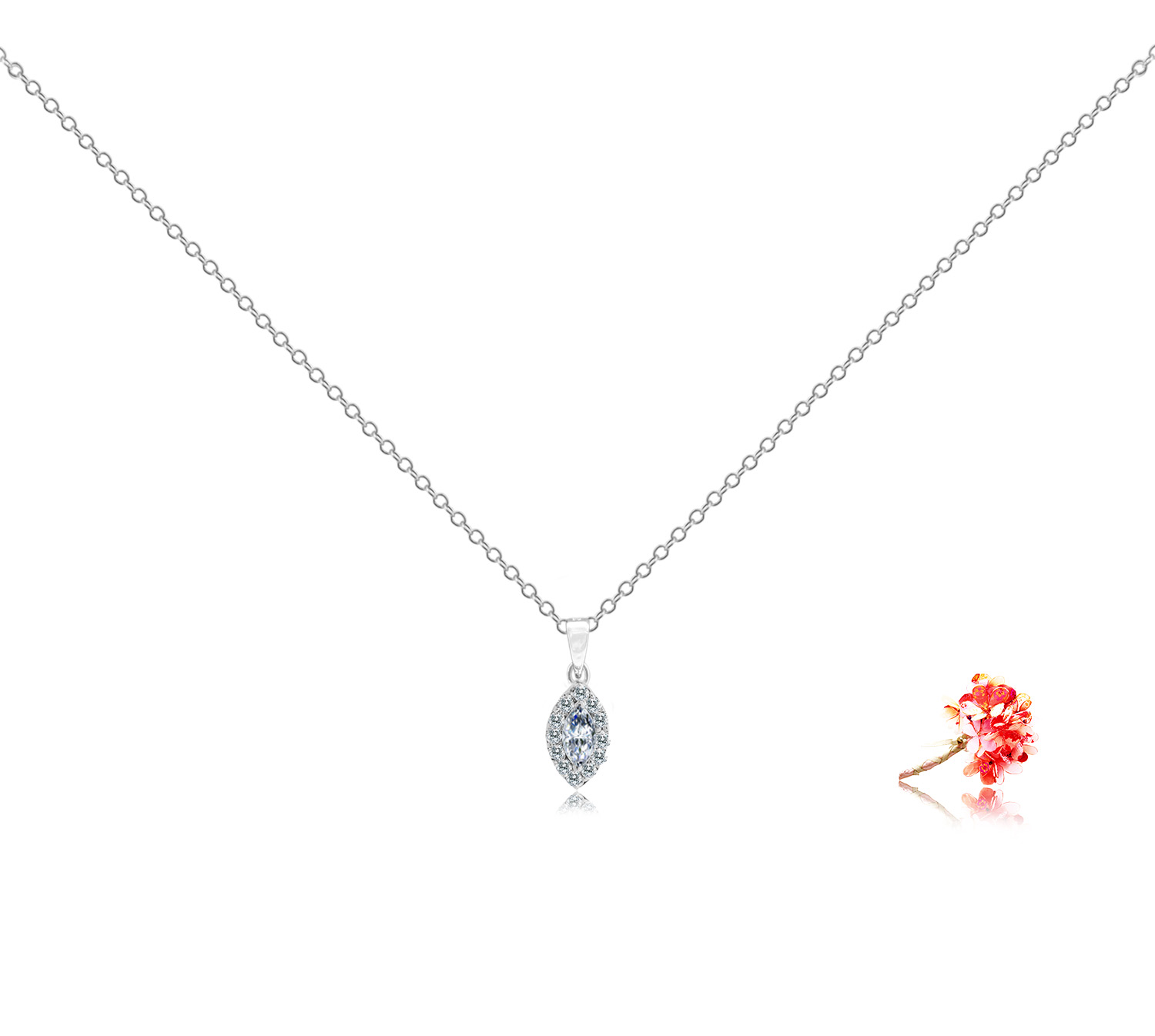 Diamond pendant with 1 marquise diamond 0.17 carat and 12 round brilliant diamonds 0.10 carat in 18k gold, white.