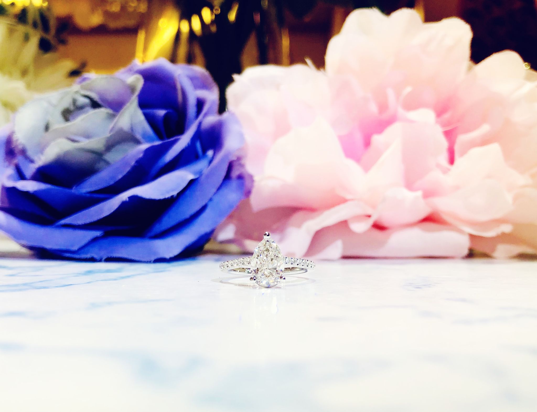 Home Bespoke / Customised Jewellery Pear Shape Diamond Ring with Pave Diamonds in 18k Gold, White – Classic Extravagant