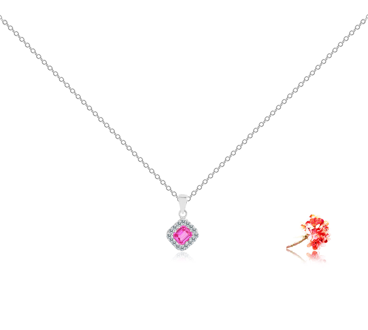 Pink sapphire pendant with 1 emerald shape pink sapphire 0.60 carat and 15 round brilliant diamonds 0.15 carat in 18k gold, white.