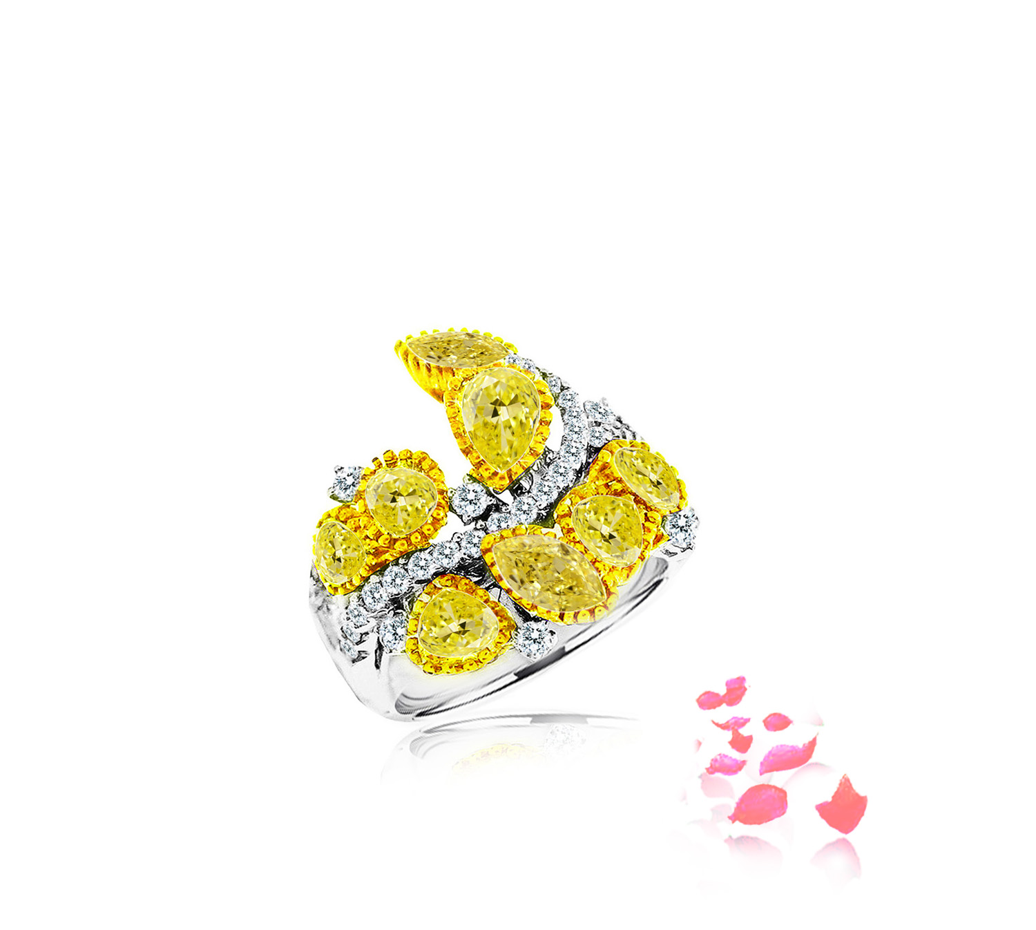 Diamond ring with 8 fancy shaped yellow diamonds 2.50 carat and 41 round brilliant diamonds 0.58 carat in 18k gold, white.