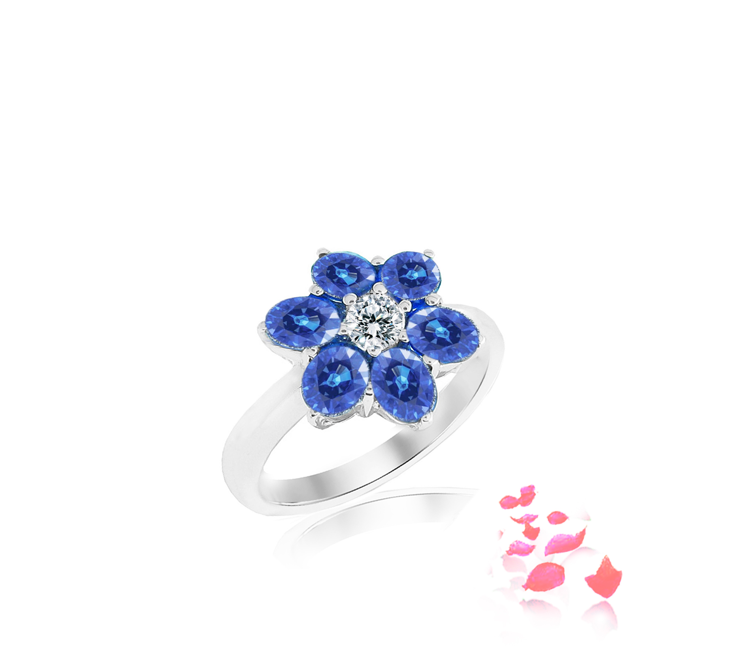 Blue sapphire diamond ring with 6 oval sapphires 2.08 carat and 1 round brilliant diamond 0.10 carat in 18k gold, white.