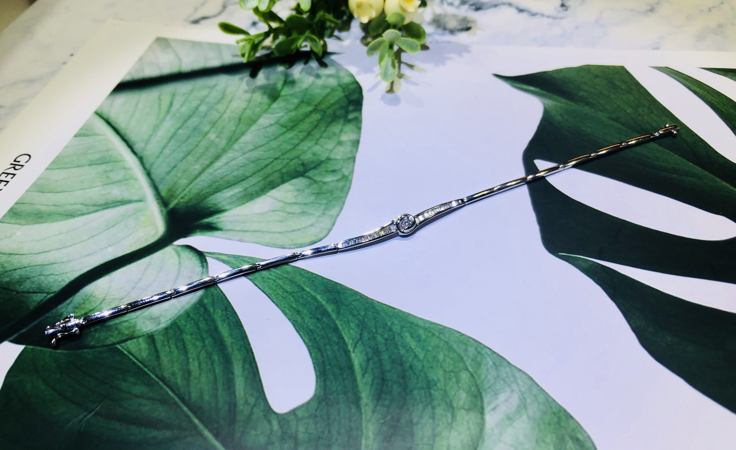 This bracelet features 1 round brilliant diamond and 35 tapered diamonds 0.209 carat in 18k white gold design.