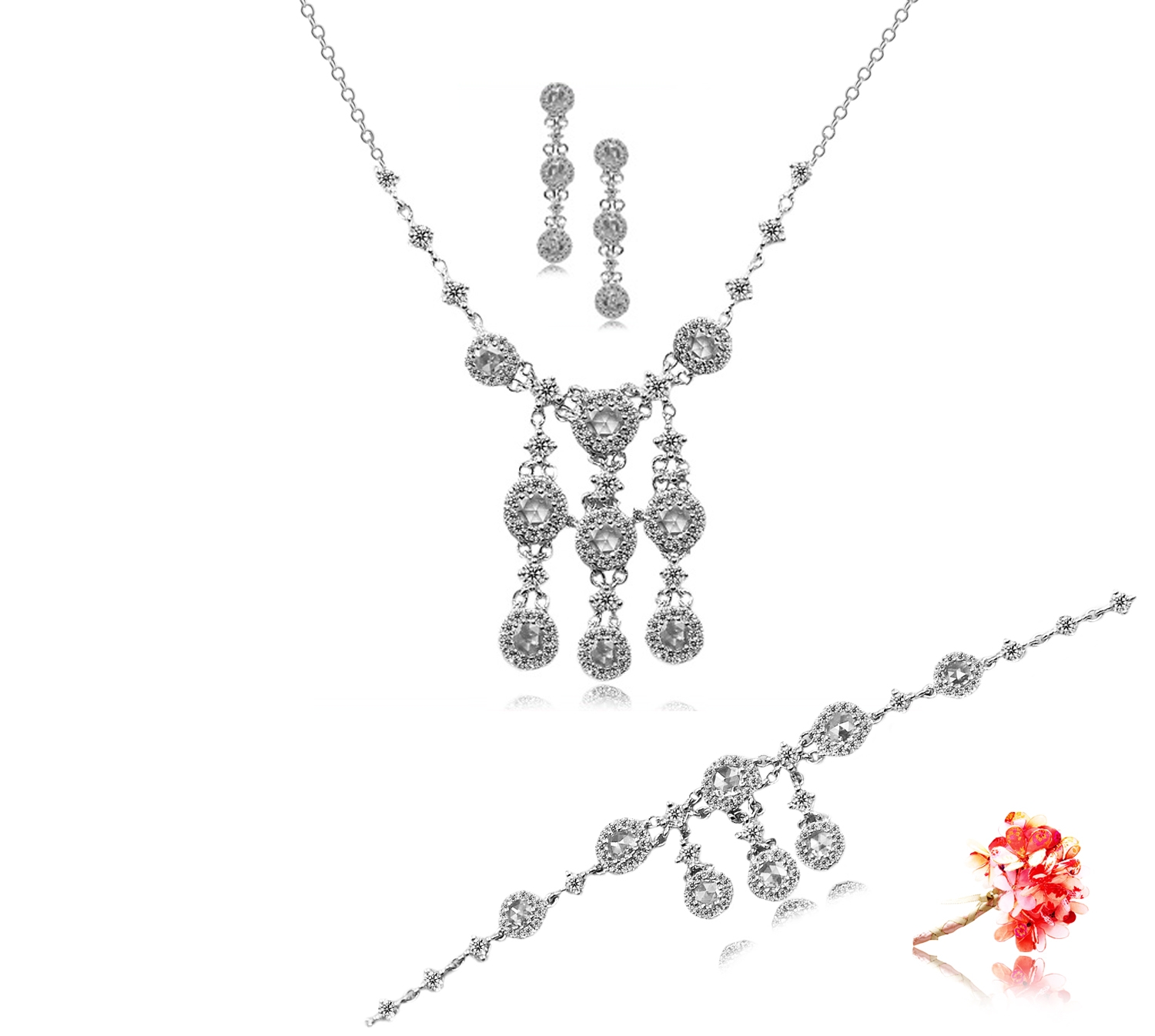 Diamond necklace with 122 round brilliant diamonds 1.08 carat and 9 rose cut diamonds 0.56 carat in 18k gold, white. (N153)