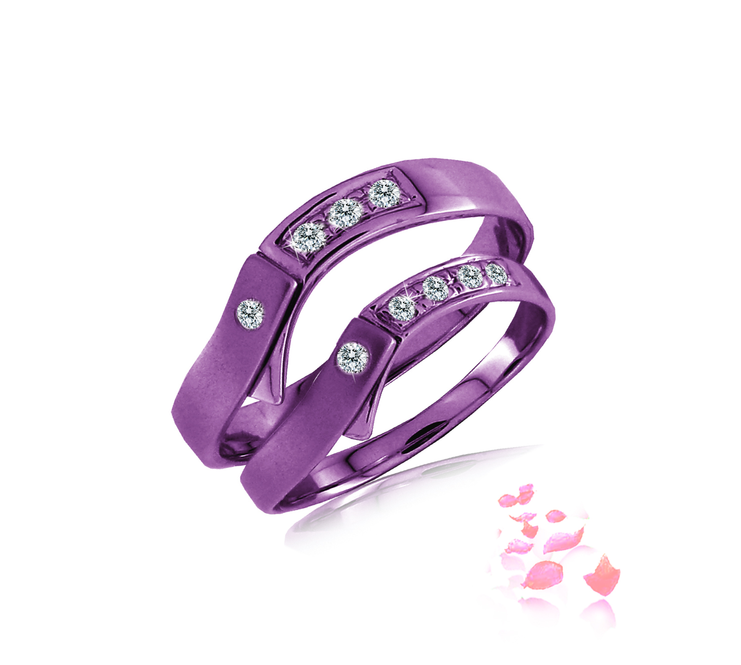 Band with 4 round brilliant diamonds in 18k gold, purple. Total carat weight est 0.05. Estimate broadness 3-3.5mm. Purple velvet matte and Purple gloss.