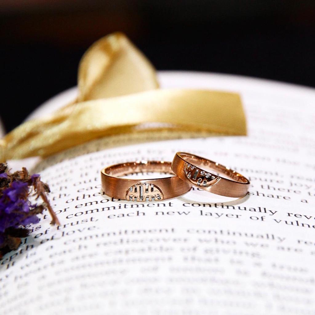 Wedding bands crafted with double happiness design in 18k gold, rose. Velvet matte finishing.