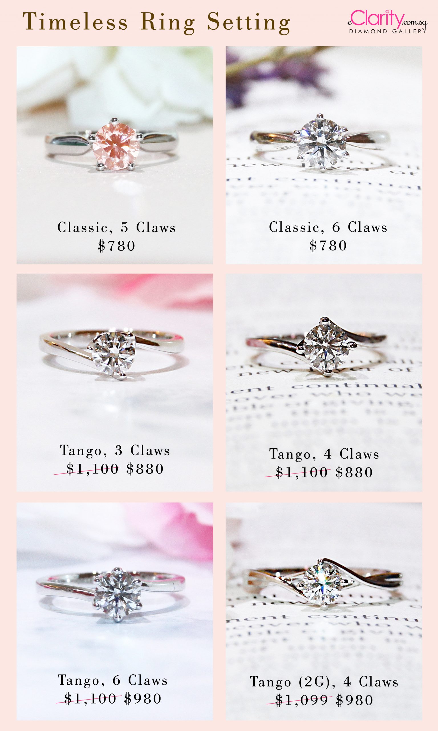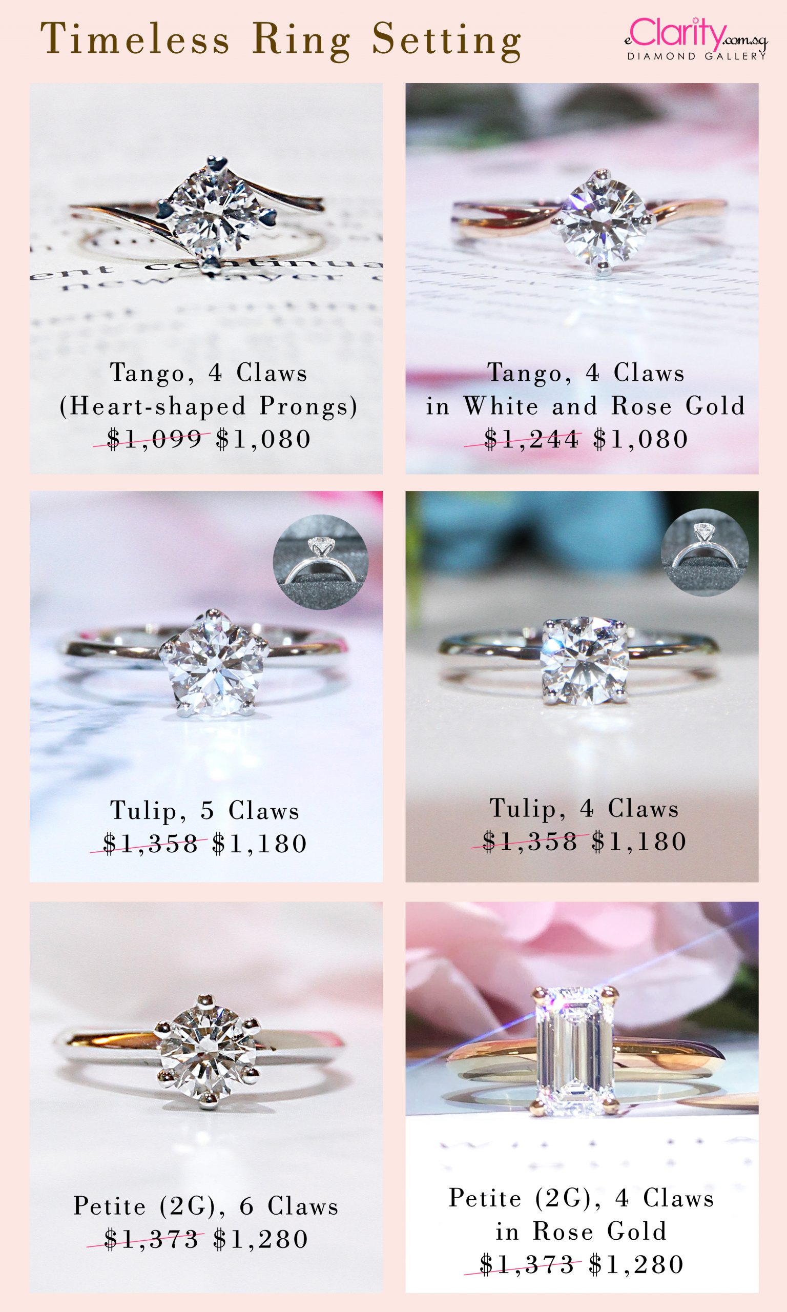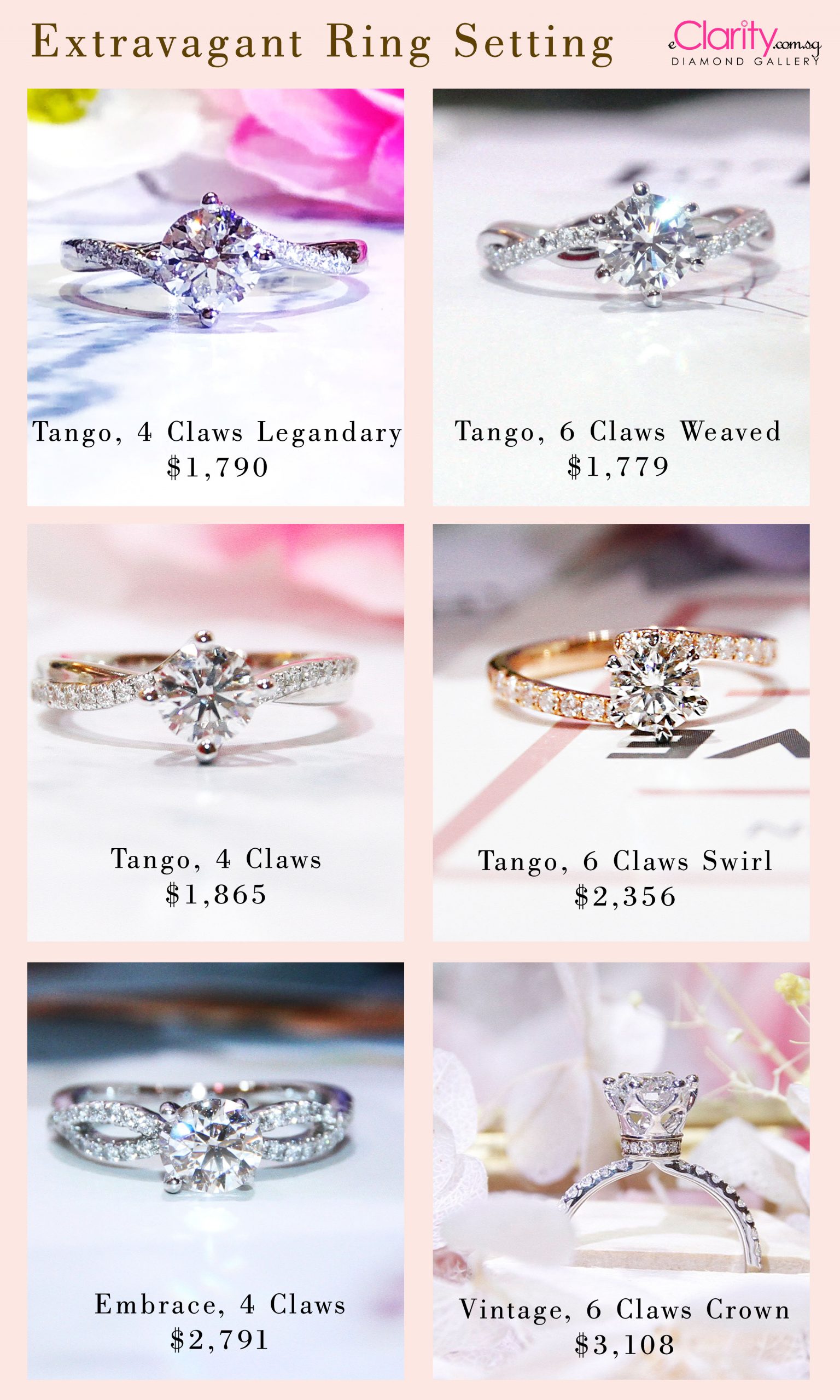Proposal ring designs, Part 2. Feeling love, the flow of curves of each diamond ring design here is highlighted with duo gold colours or layered tiers, which magnifies the striking essence of the middle diamond which is GIA certified.