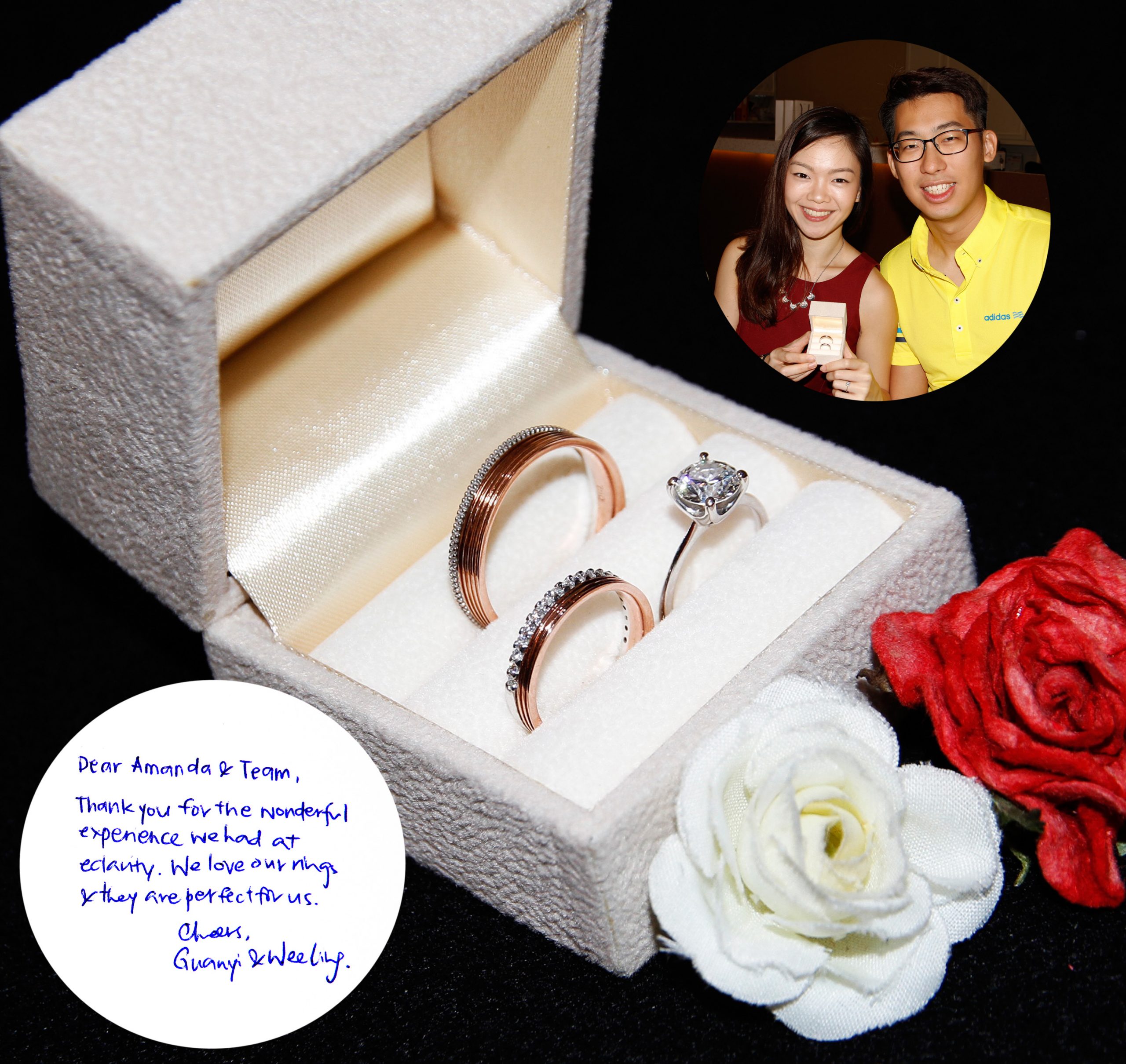“Dear Amanda & team, thank you for the wonderful experience we had at eClarity. We love our rings & they are perfect for us.” – Cheers, Guanyi & Wee Ling