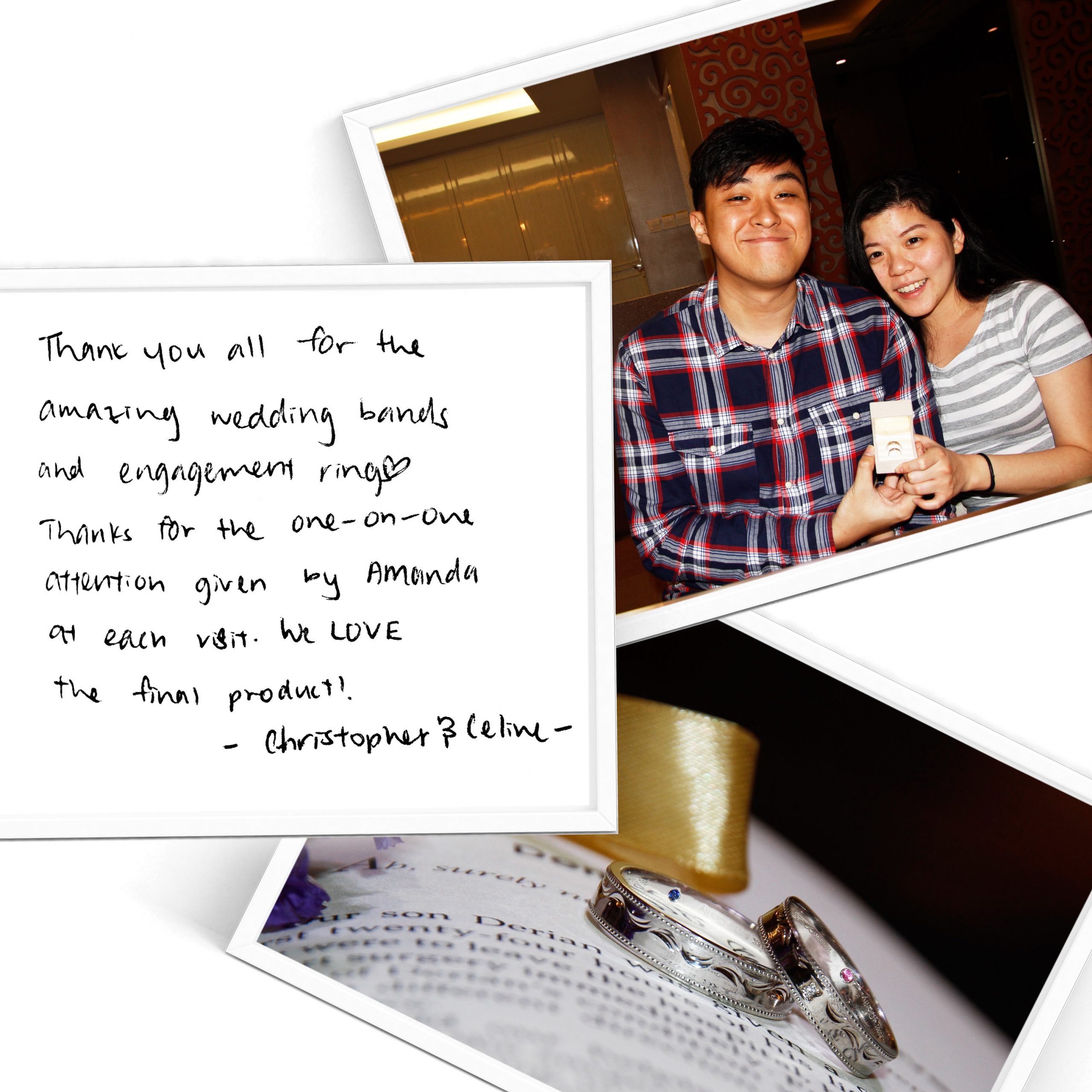 “Thank you all for the amazing wedding bands and engagement ring. Thanks for the one-on-one attention given by Amanda at each visit. We LOVE the final product!” – Christopher & Celine