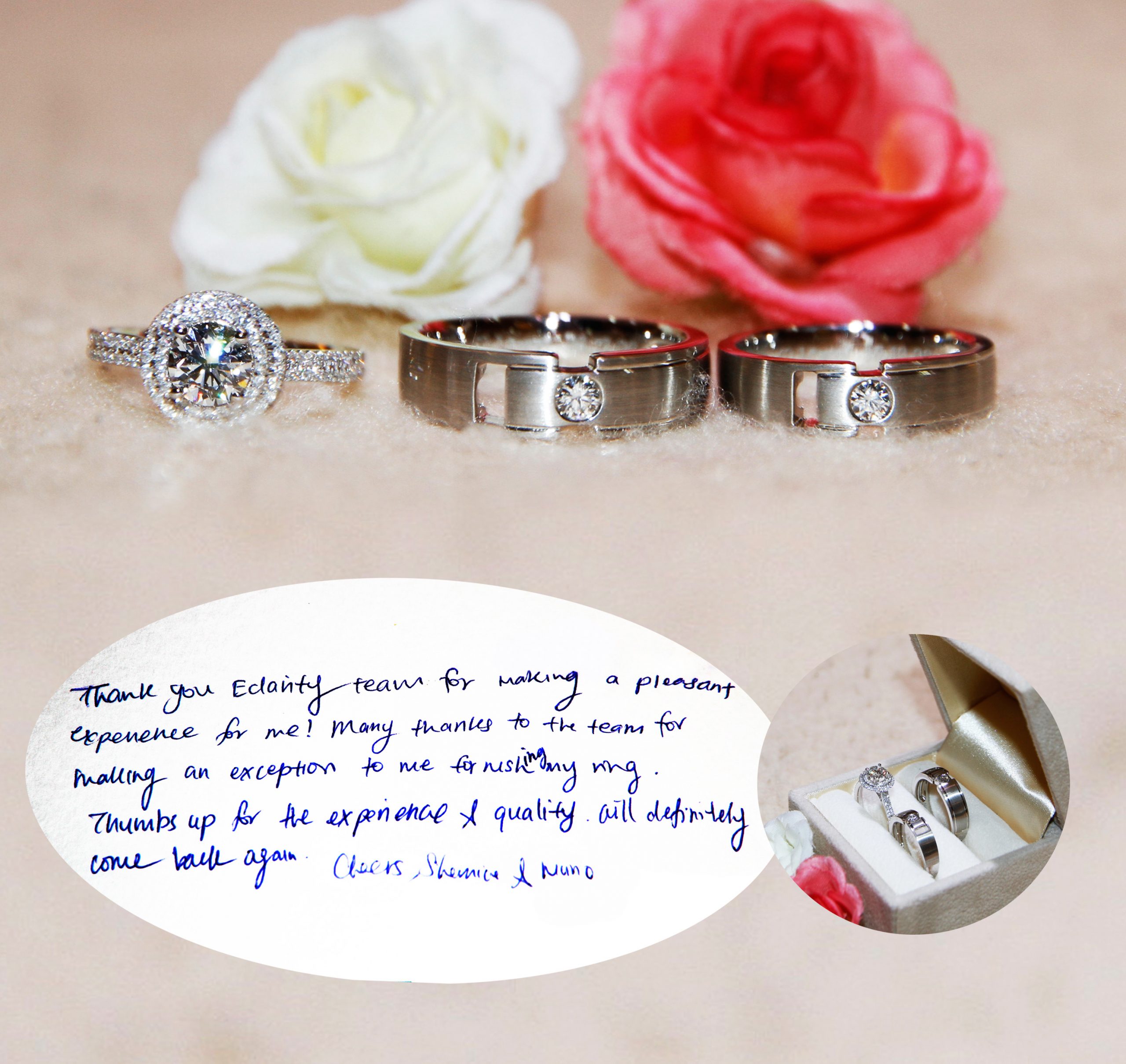 “Thank you eClarity team for making a pleasant experience for me! Many thanks to the team for making an exception to me for rushing my ring. Thumbs up for the experience & quality all definitely come back again.”- Cheers, Shernice & Nuno